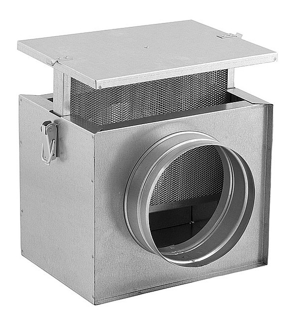 Filtrační box izolovaný se zatahovacím kovovým filtrem, vhodný pro vytvoření distribučního systému horkého vzduchu z krbu.